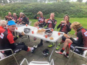 Maar ja, in mijn achterhoofd weet ik dat er zondag alweer een mooie rit komt in Hoksebarge. Fietsen naar het terras van onze sponsor. Het appelgebak van Ter Huurne smaakt ook altijd fantastisch na een fysieke inspanning. Dat zal zondag niet anders zijn. Ook dat genoegen moet ik aan me voorbij laten gaan. Maar daar kom ik wel weer overheen. Een mens moet wat te wensen overhouden. Daarom: geniet zondag van de rit en de traktatie. Lang leve de club! Santé!