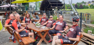 Omdat de weersverwachtingen er wat spannend uitzagen, vond het organisatorisch comité dat er geen onnodig oponthoud mocht zijn wilden we nog wat fietsen, dus binnen het uur hadden alle racers zich in hun fietspakjes gehesen, proviand in de achterzakken gepropt en de bidonhouders op de fietsen met volle flessen bevoorraad.