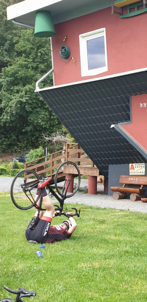 Even uit het raam kijken: is het droog of is het nat. En daar begon de twijfel: shit, het is helemaal bewolkt en nevelig buiten. En het regent ook nog. En nu dan? Hoe laat vertrekken we eigenlijk? Negen uur? Tien uur? Eerst maar eens ontbijten. Daarna maar eens een been buiten de deur zetten. Brrrrr, wat koud. Korte of lange broek aan, korte mouwen, lange mouwen of armwarmers? Regenjasje? Na veel vijven en zessen stonden de renners buiten te kleumen voor de deur van de fietskelder. Iemand met een lege band. 'Wie heeft de pomp? Die ligt in de auto en ik heb de sleutel niet bij me. Die ligt boven in de kamer. Wie heeft de sleutel van de kamer? Geen idee. Naar de receptie dan maar'. Eindelijk verschijnt de pomp ten tonele. Inmiddels was het al half tien. Geloof het of niet, maar de T2 rijders waren vanmorgen eerder op pad dan die van T1.