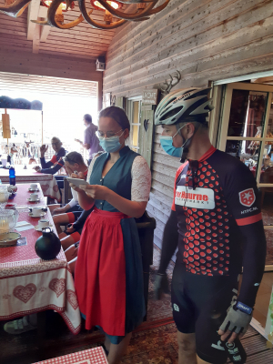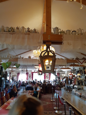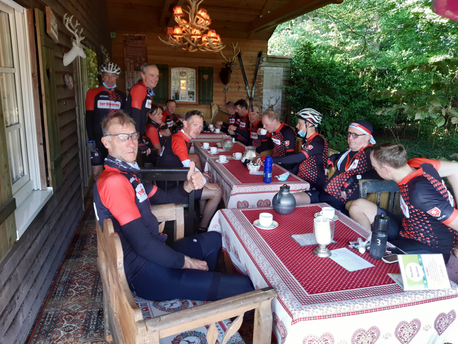 We komen langs het vakantiepark’’de Twee Bruggen’’ en komen aan bij restaurant Vivaldi hier gaan we het spoor over, wat we deze dag nog in totaal 4 keer doe, we vervolgen onze rit weer richting Hemden in Duitsland. Hier zijn geen fietspaden dus het gaat 1 km over de Hamaland Straße daarna slaan we links af. In het plaatsje Werth is het nog 5 km tot aan onze koffie stop. Aan gekomen bij Café Waldsee, na 64 Km met een gemiddelde van 28,6Km/u, in Haminklen wacht ons een verrassing, je stapt er zo het sprookje van Hans en Grietje binnen. De mondkapjes worden voorgedaan en we worden naar onze plaats gewezen. De koffie kopjes stonden al op tafel, want we hadden een plaats gereserveerd. We waren niet de enige gasten alles zat vol met gasten aan het frühstück of de brunch. De kannen koffie werden rijkelijk geserveerd door de dames in dirndls, en we konden kiezen uit verschillende stukjes taart. De taartpunten waren zo groot dat zelfs Rudy Groot Zevert er een buikje van kreeg. Na 45 minuten sta ik op om te gaan betalen.