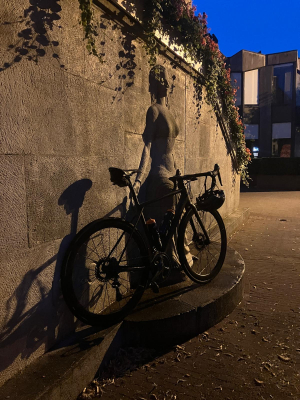 Heb ik eigenlijk wel geslapen, vroeg ik me af toen ik om kwart voor vier naast mijn bed stond. Maar ik constateerde dat dat eigenlijk nog wel meeviel. Ondanks het vroege tijdstip toch nog drie boterhammen en een bakje kwark naar binnen gewerkt. Het fietsje was tiptop in orde. Ik had al eerder afgerekend met mijn latex bubbelende achterband, dus de wetenschap dat er een fonkelnieuwe band (man, man, wat is dat spul duur!) om mijn achterwiel lag, gaf een heel goed gevoel. Er werd van tevoren nogal wat geklaagd over de sputters die mijn band verspreidde over mijn achterliggers tijdens de trainingen.